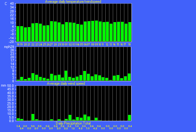 Maximum windspeed = 18.4 mph from 118°(ESE) on day 05 at time 19:37